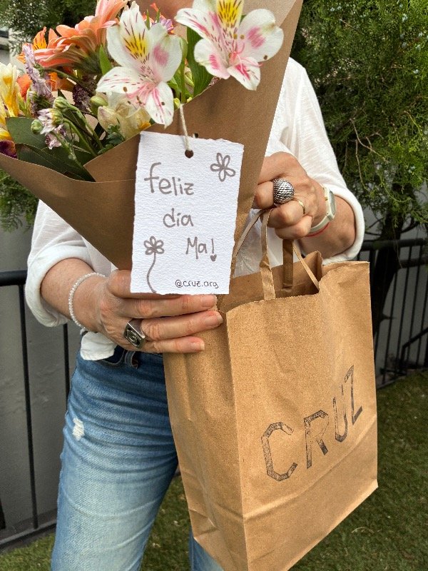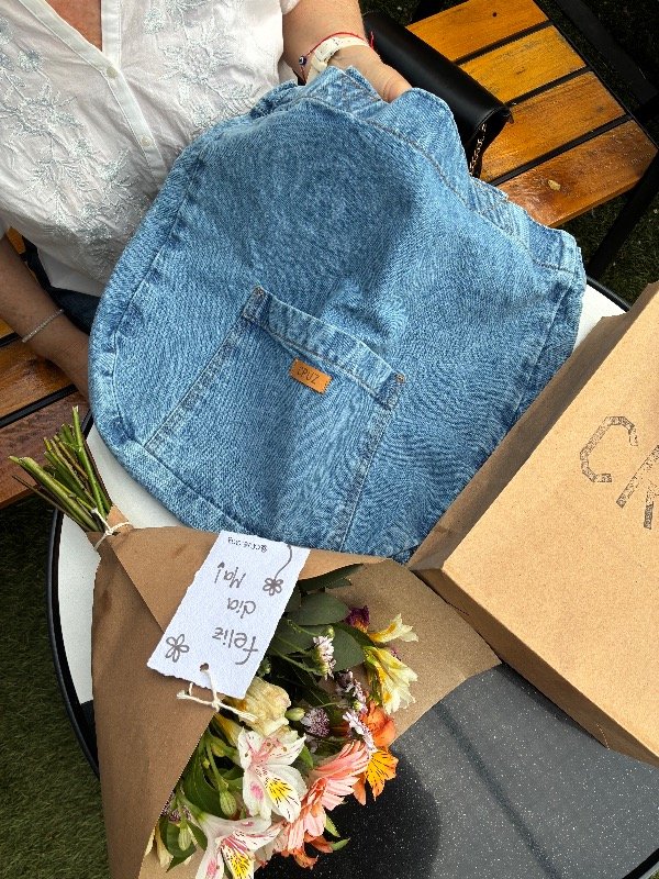 Ramo de flores frescas + bolso denim azul + gorra a elección